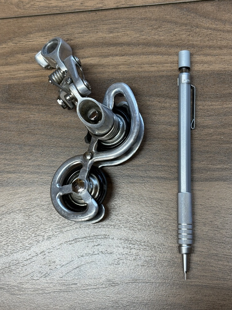 とても小さなボディに、むき出しのテンションスプリングやリターンスプリングが組み合わされ、軽量化とデザインが見事に調和し、工芸品のようであった。
